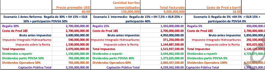 El impacto económico potencial de la reforma es de gran magnitud. Si se toma como referencia una comercialización de 150 millones de barriles a un precio promedio de 60 USD por barril, el valor total facturado ascendería a 9.000 millones de USD. Bajo un esquema previo a la reforma, la captación pública total (Regalía, impuestos y participación de PDVSA)[7] alcanzaría 5.535 millones de USD, es decir, aproximadamente 61,5% del valor bruto. Bajo un escenario extremo permitido por la nueva ley, esa captación caería a 1.576 millones de USD, apenas 17,5% del total. La diferencia entre ambos escenarios asciende, por tanto, a 3.959 millones de USD en solo tres meses.