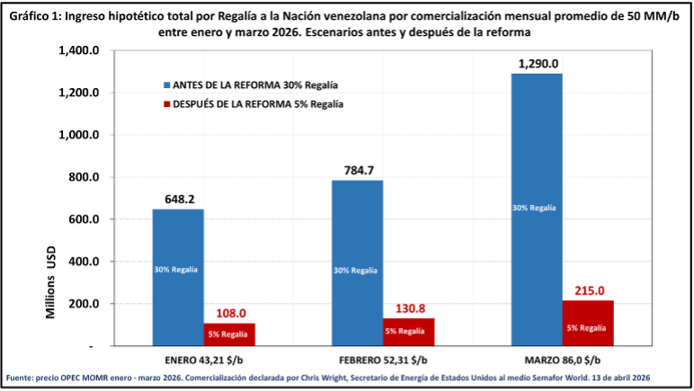 El Gráfico 1 ilustra el total de comercialización mensual de enero a marzo 2026 de crudo venezolano según lo declarado por el secretario de Energía de Estados Unidos. En una venta mensual de 50 millones promedio, la diferencia entre aplicar una regalía de 30% y una de 5% resulta muy significativa. En enero, la captación por regalía caería de 648,2 millones a 108,0 millones de dólares; en febrero, de 784,7 millones a 130,8 millones de dólares; y en marzo, de 1.290,0 millones a 215,0 millones de dólares. El ingreso de la Nación se reduce precisamente cuando el precio del crudo aumenta. En un contexto de precios altos, una regalía reducida convierte el aumento de precios en una ventaja captada principalmente por el operador.
